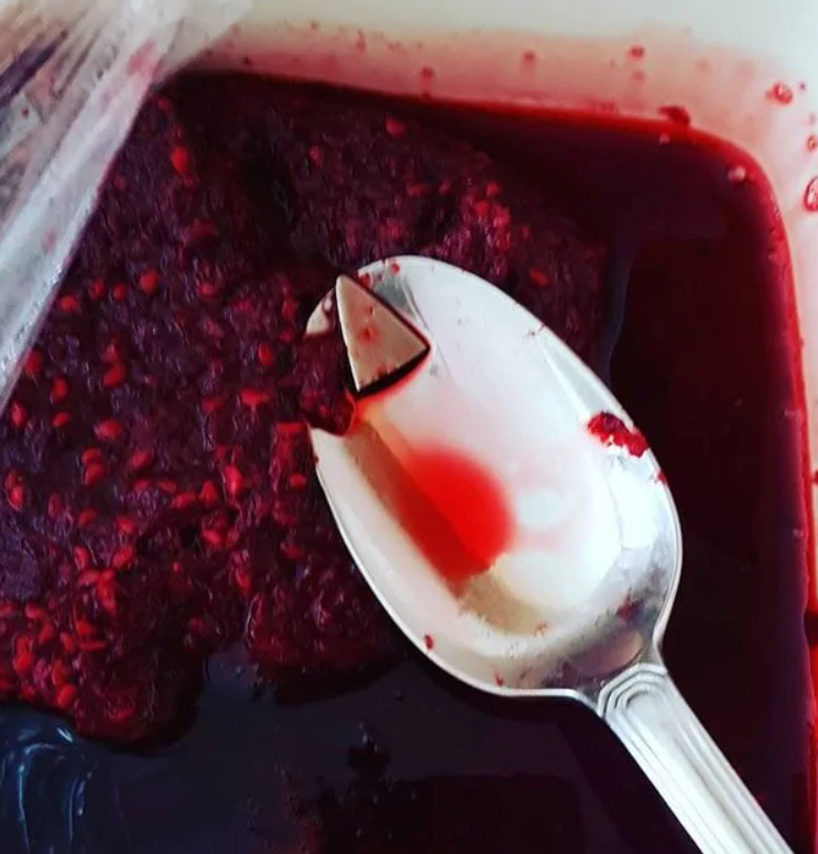 Váš dezert obsahuje hrot noža. Znepokojivé, kým si nespomeniete, že sa tam musel dostať včera, keď ste ovocie rozbíjali nožom.