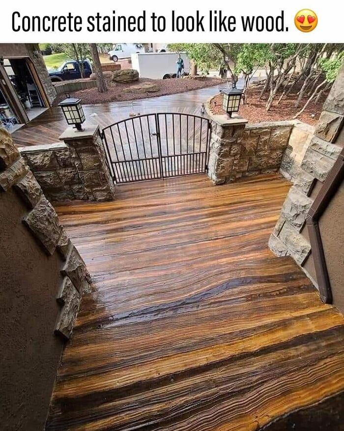 #5 Betónové schody natreté hnedými a béžovými pruhmi, vyrobené tak, aby vyzerali ako drevo. Pruhy sú rovnobežné so schodmi. Dokonca ani nie je možné identifikovať počet schodov.