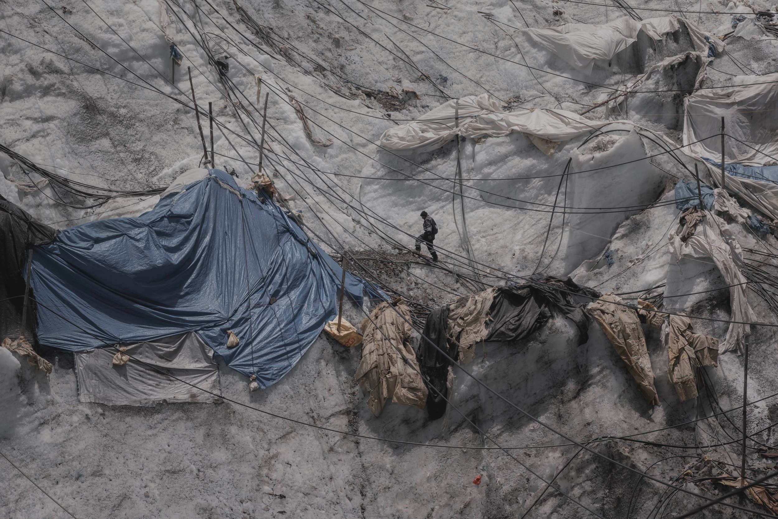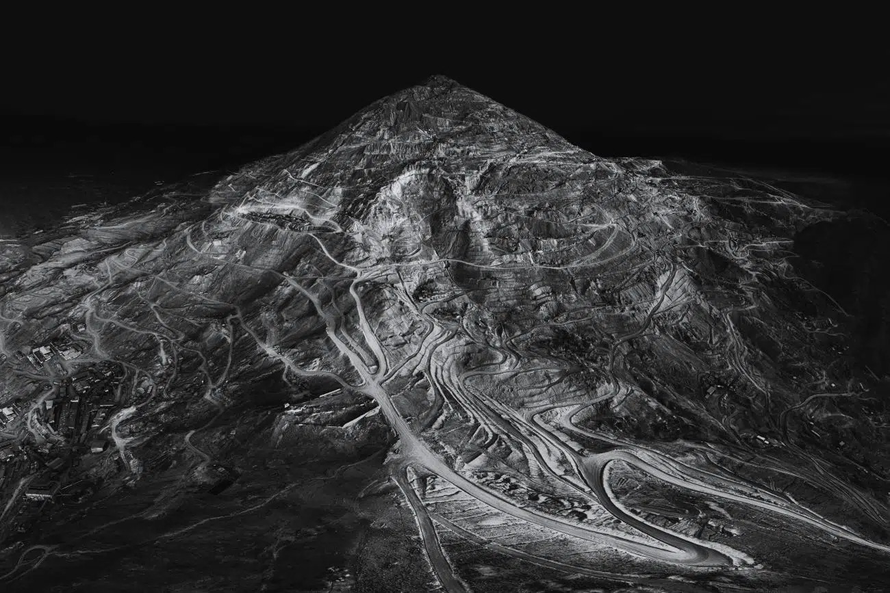 Fotografia zachytáva jeden z najväčších dôsledkov ľudskej činnosti na krajinu – rozľahlú medenú baňu, ktorá sa neúprosne zahryzáva do zeme.