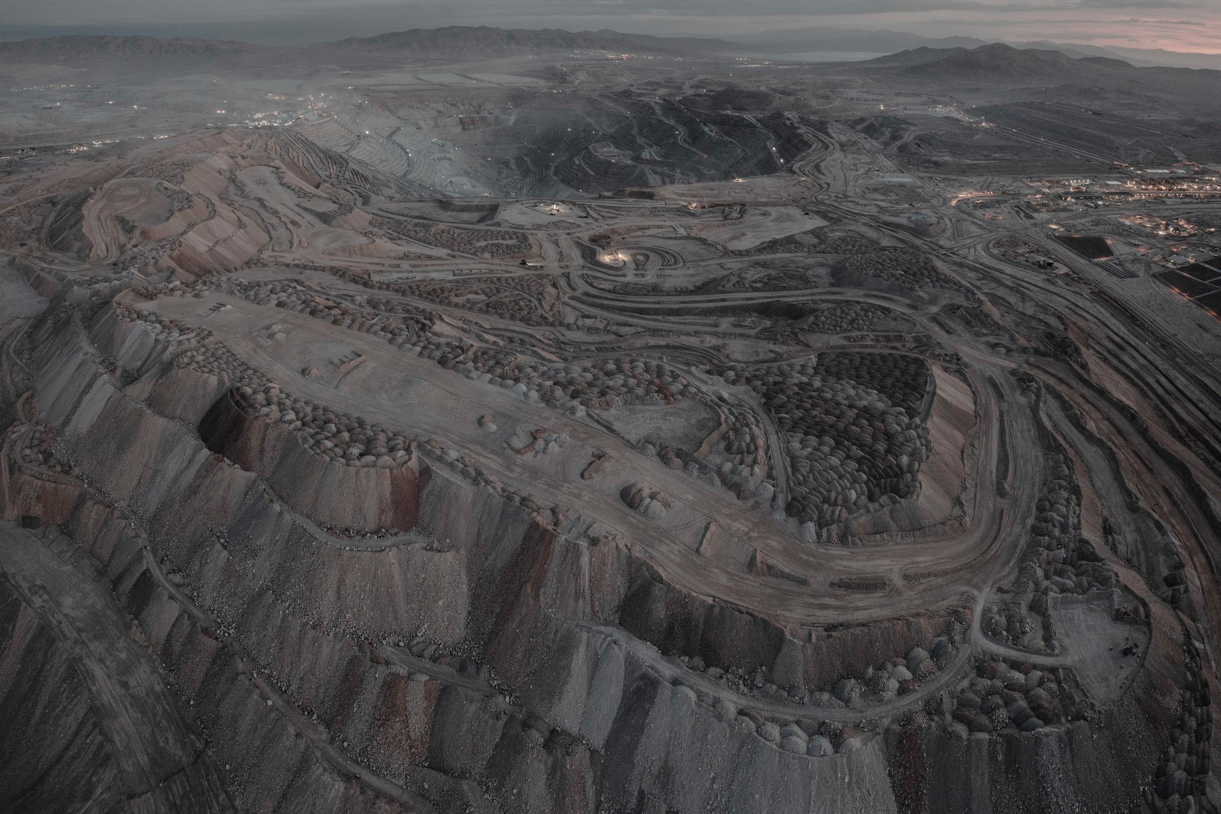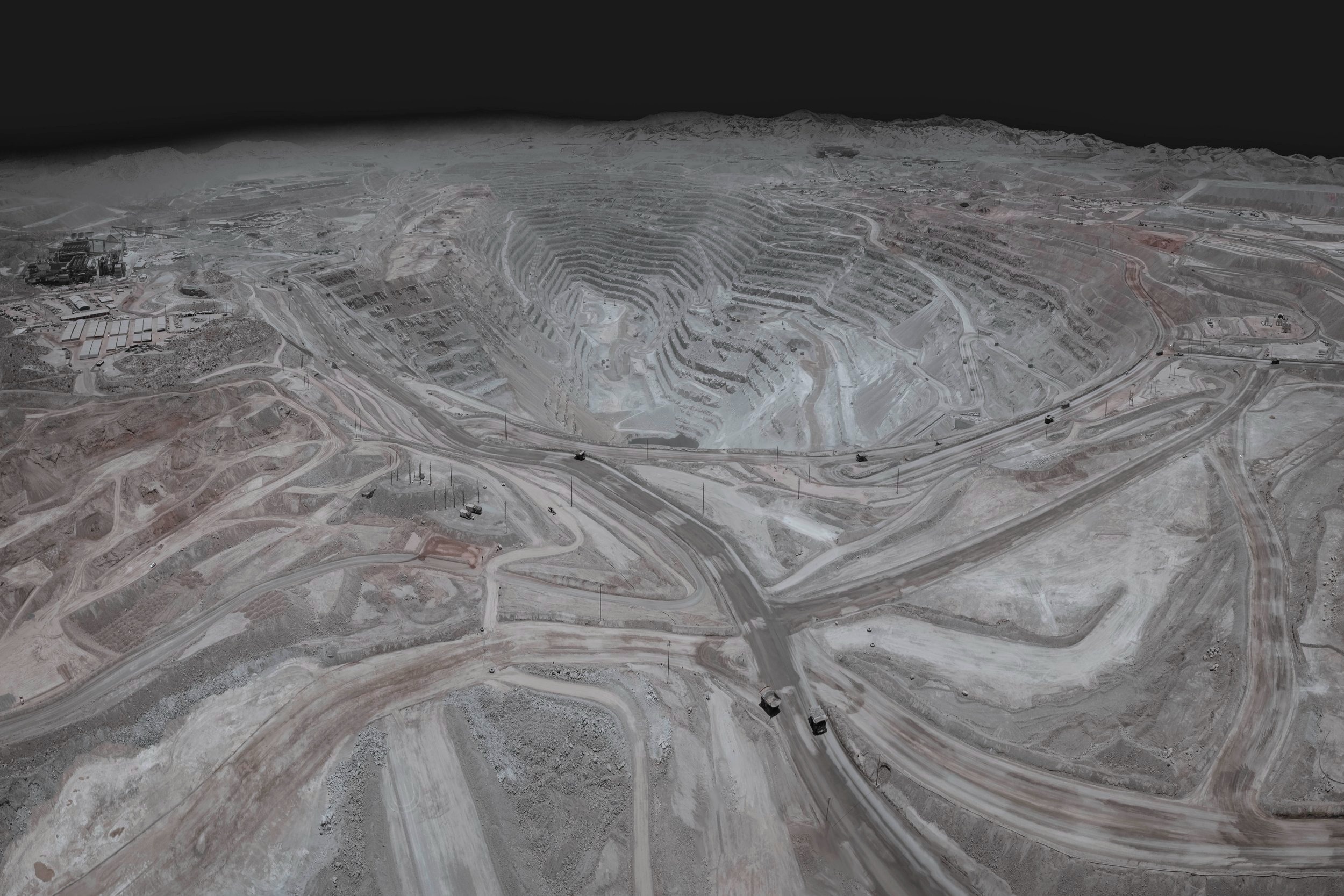 Fotografia zachytáva jeden z najväčších dôsledkov ľudskej činnosti na krajinu – rozľahlú medenú baňu, ktorá sa neúprosne zahryzáva do zeme.