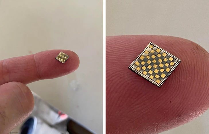 #10 Šachovnica vyrobená zo zlata a striebra. Každá má rozmer 0,7×0,7 mm.