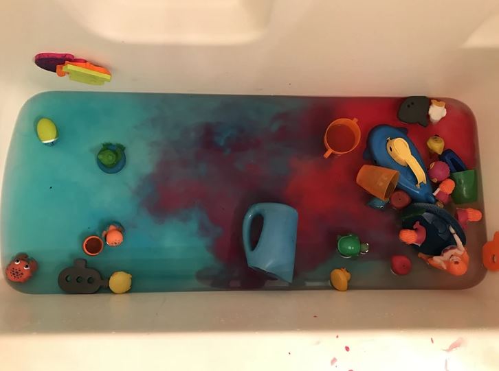 #11 Detská vaňa s farebnou vodou a hračkami vyzerá ako abstraktné umenie