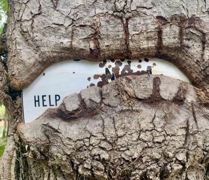 #15 Okolo tejto tabule vyrástol strom, takže viditeľné je len slovo „pomoc“