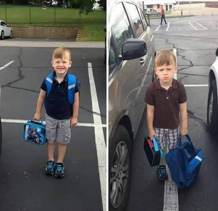 Tentokrát sme si pre vás v rámci kategórie Virálne správy pripravili trošku netradičnú kompiláciu vtipných fotografií, ktoré zachytávajú deti pred a po nástupe do školy. Ako uvidíte sami na záberoch v článku, väčšina detí sa po prvom dni v školských laviciach radikálne zmení. Minimálne emócie v daný moment sú diametrálne odlišné. Máte aj vy podobnú fotku s vašou ratolesťou?