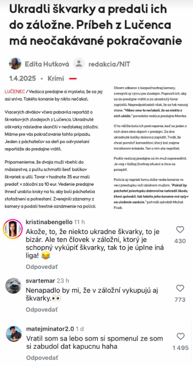 Na úvod ťa pobavia komentáre Slovákov a Sloveniek na informáciu o krádeži škvarkov, ktoré skončili v záložni. Ktoré aprílové žarty vypálili úplne inak? No a na záver ťa pobavia reakcie na priznanie baby, ktorá sa pochválila, že mala styk s chalanom, no teraz sa bojí, že jej meškajú svoje dni a je tehotná. Toto všetko a ešte oveľa viac nájdeš v najnovšom pokračovaní série Bomby zo sociálnych sietí, ktoré vystihujú ľudskú populáciu viac ako dostatočne.