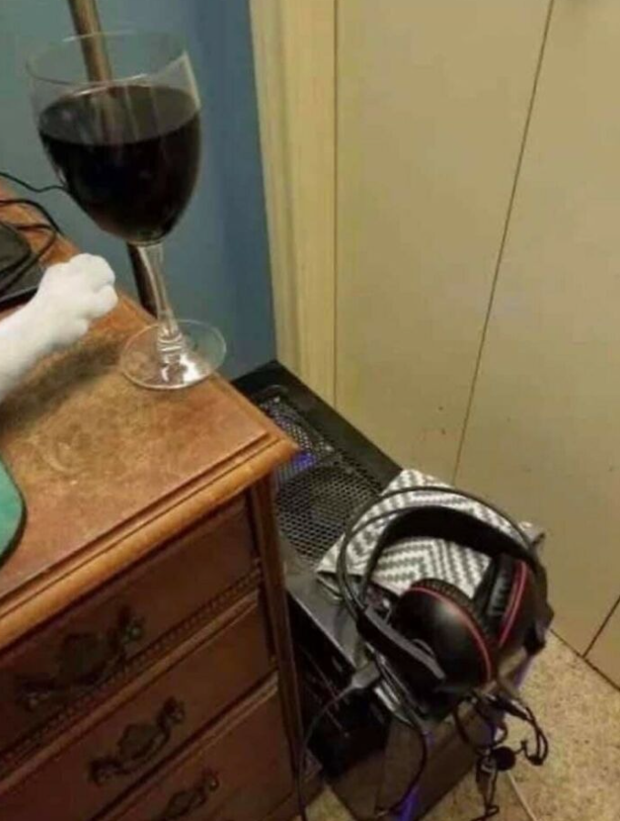 Áno, tá labka patrí mačke. A áno, pohár plný vína o chvíľu poletí na počítač.