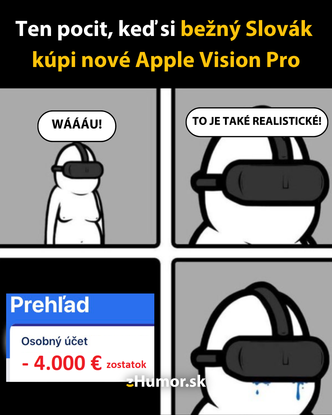 Spoločnosť Apple uviedla na americký trh okuliare pre rozšírenú aj virtuálnu realitu Apple Vision Pro. Je ich možné ovládať rukami, pohľadom a hlasom. Prví zákazníci si budú môcť zakúpiť nové okuliare na začiatku roka 2024 za cenu 3 499 dolárov, pričom na Slovensku sa cena môže približovať sume 4 000 eur. No a takto by to vyzeralo, keby sa tieto okuliare dostanú do rúk bežného Slováka, ktorý väčšinou žije od výplaty k výplate.