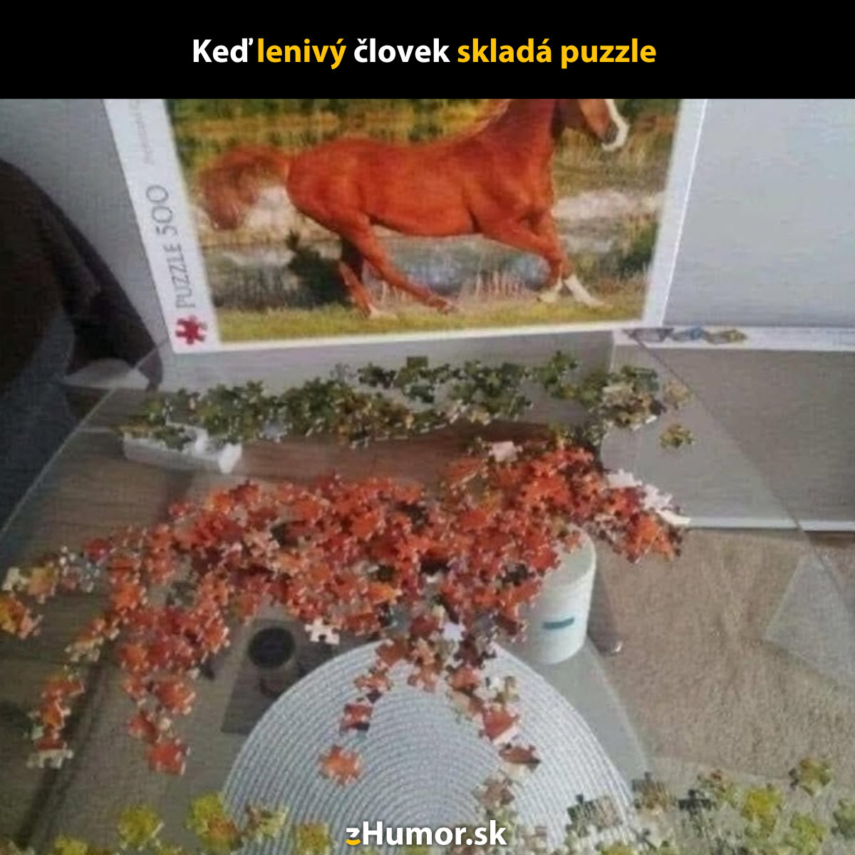 Skladanie puzzle je veľmi pokojná a pohodová aktivita, ktorá dokáže zabaviť ľudí v takmer každom veku. Vyžaduje si však aj trpezlivosť, ktorú nemusí mať každý. Potom to môže vyzerať ako napríklad na tomto memečku.