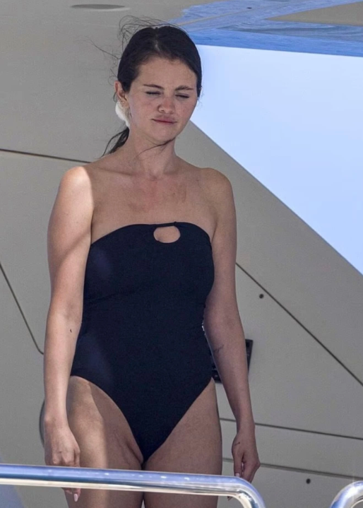 Krásne jej ukázali na postave počas párty na palube luxusnej lode, kde bola so svojimi najlepšími priateľmi. Gomezovej odvážne plavky ukazovali aj jej zadok a na hrudníku mali výkroj. Popová hviezda si vlasy zopla do nízkeho strapatého drdola.